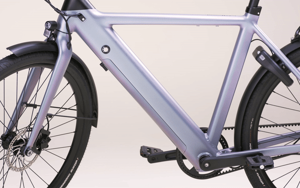 Drehe dein Vorderrad leicht nach links, um besser an den Sitz deines Akkus zu gelangen. Führe deinen Schlüssel ein und drehe ihn im Uhrzeigersinn, wodurch sich dein Akku schonmal teilweise löst, allerdings noch durch eine weitere Lasche gesichert ist. Um die Sicherheitslasche zu lösen, drehst du einmal am kleinen Hebel und hältst dabei mit deiner freien Hand am Akku fest, um es abzunehmen.