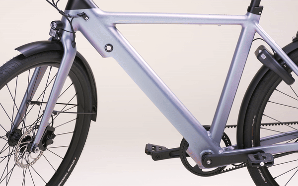 Drehe dein Vorderrad leicht nach links, um besser an den Sitz deines Akkus zu gelangen. Führe zuerst den unteren Teil des Akkus in den Rahmen ein und anschließend den Rest, bis sich der orangefarbene metallene Riegel mit einem hörbaren ‘Klick’ verschließt. Verwende beide Hände, um den Akku vollständig in den Rahmen zu drücken, sodass er bündig abschließt.
