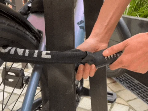 Always lock through the frame. For maximum security, put the lock through the frame and the rear wheel. If the chain lock is loose, wrap it around itself or another part of the bike to tighten it.